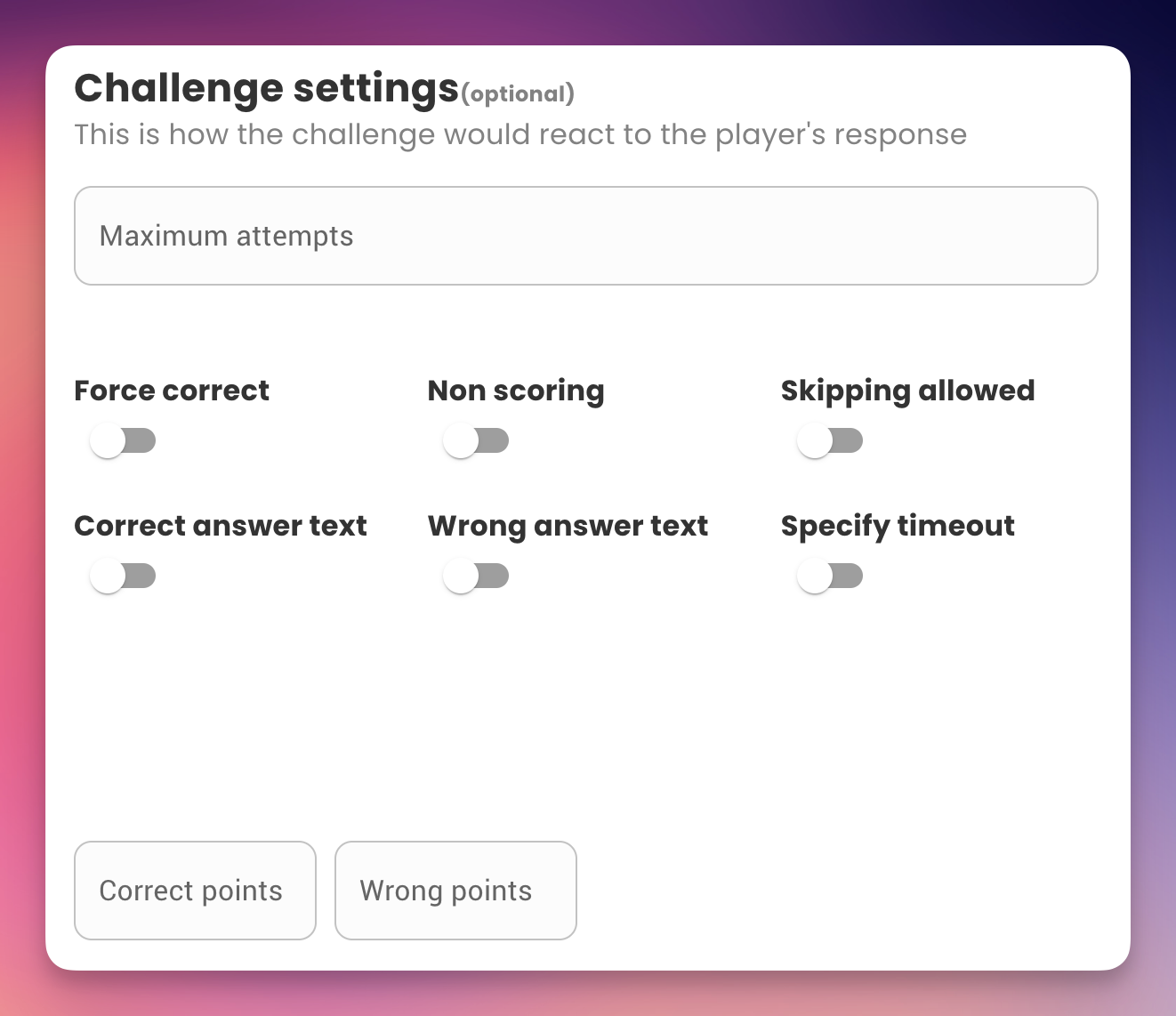 Adds a skip button to the user screen for this challenge. Skipping does not add or take away points.