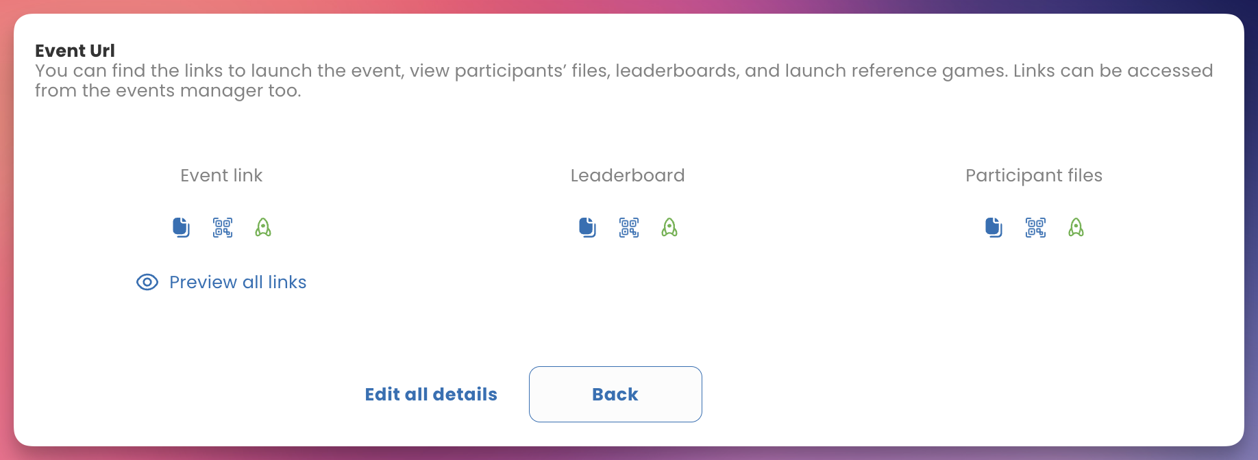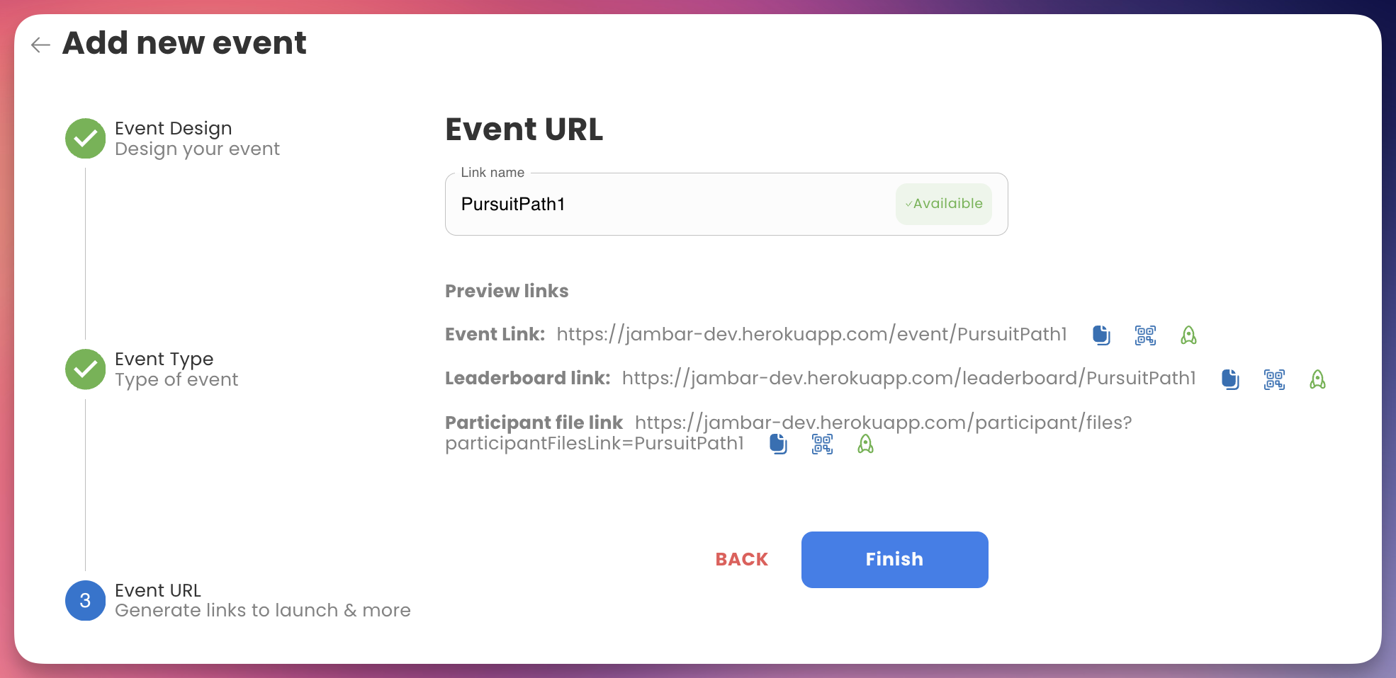 The Event Link, Leaderboard Link and Participant File Link will appear. You should copy the links down into somewhere safe.