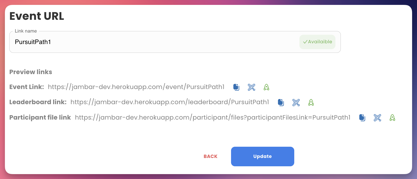 The Event URL can be changed here. Once there are changes, the Event Link, Leaderboard Link and Participant file Link will be updated.