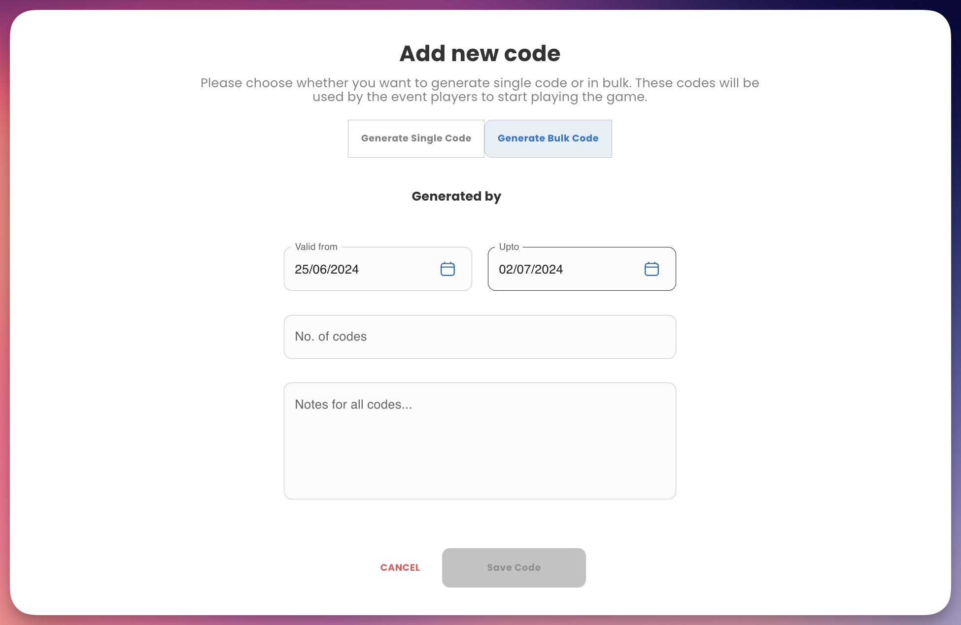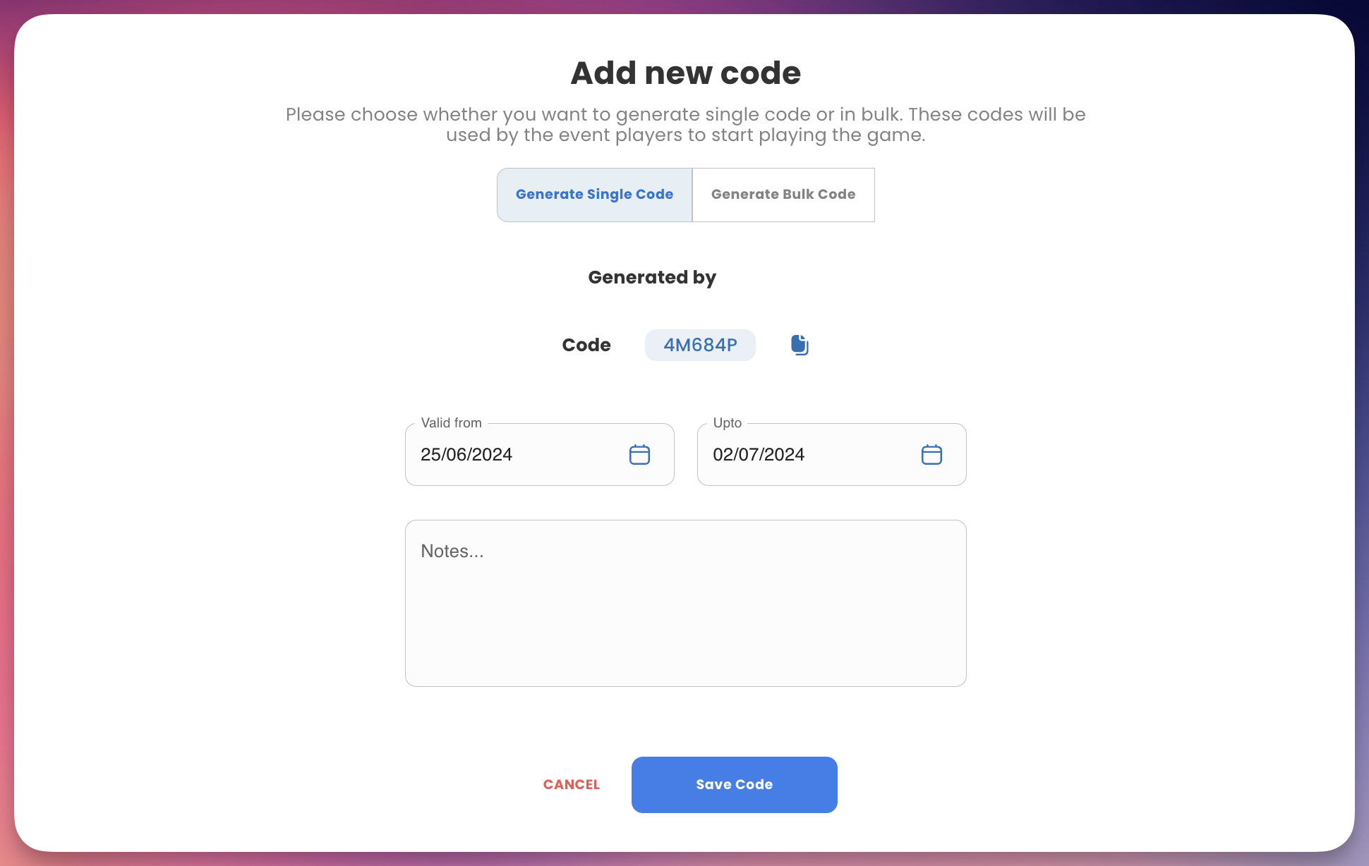 "Generate Code" will bring you to the Code Generation Page, where you can create different codes for different teams to join the game.