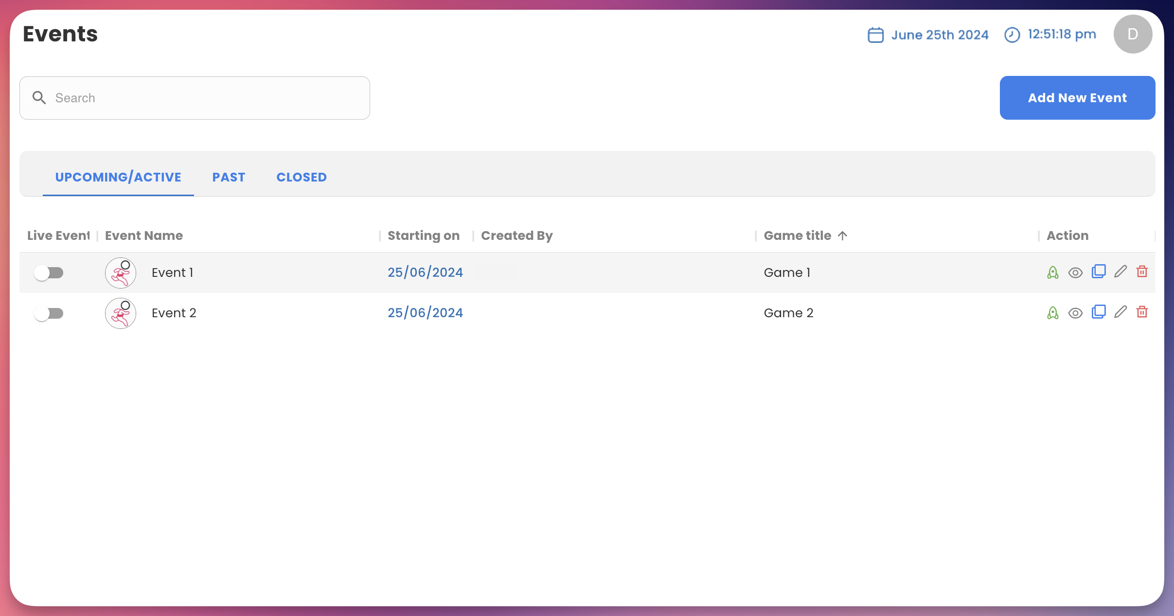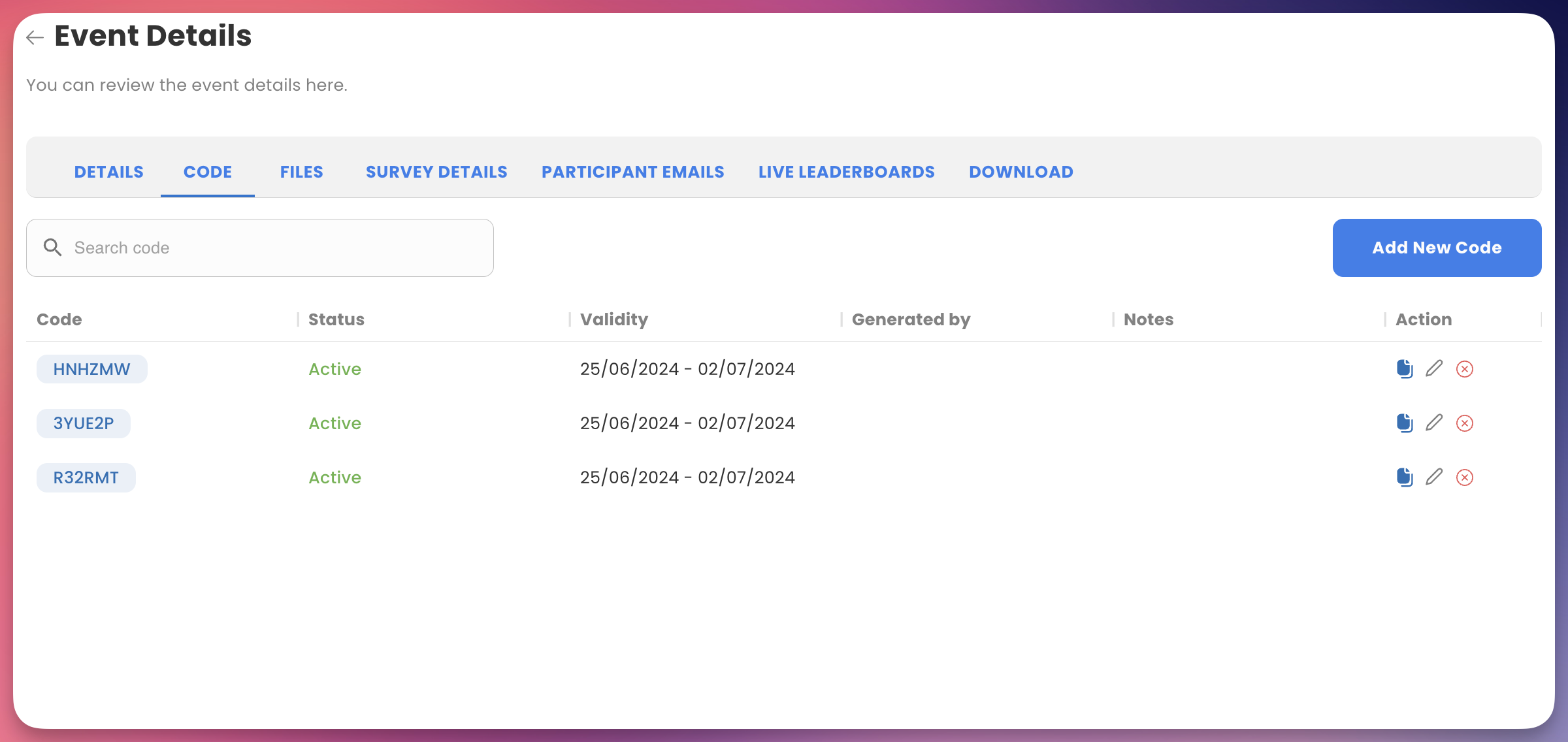 Once you have created the codes, you will need to switch the Events to "Live" before the Event will start